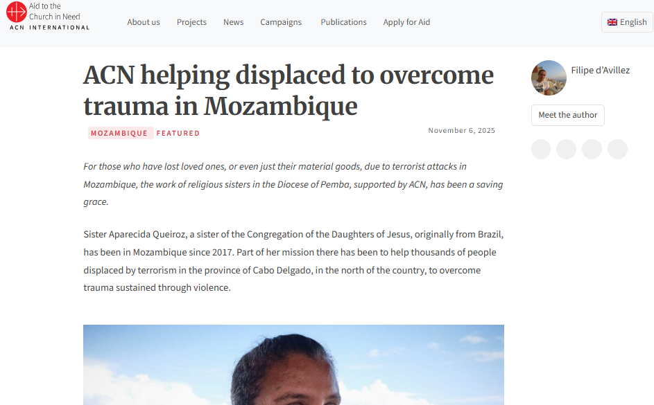 Sister Aparecida explains how she helps victims of Cabo Delgado terrorism to overcome their trauma. I wrote about this for ACN International, you can read the full article here.